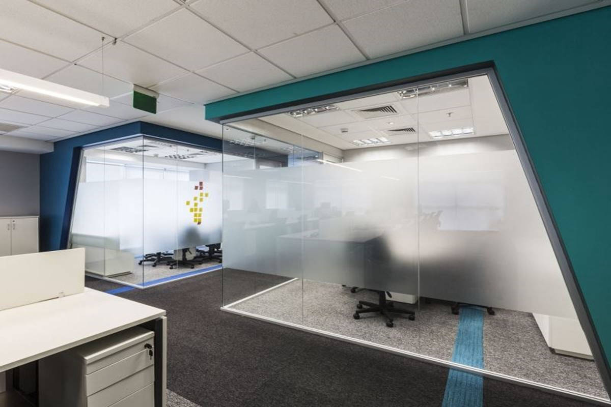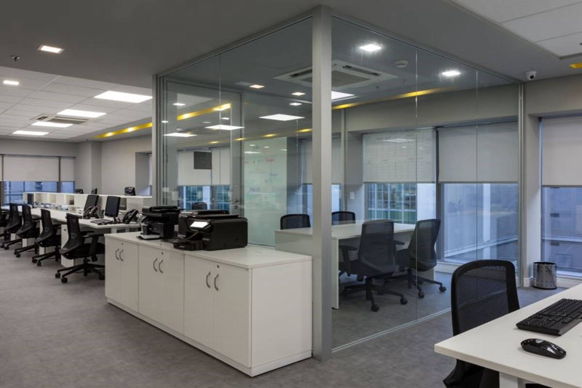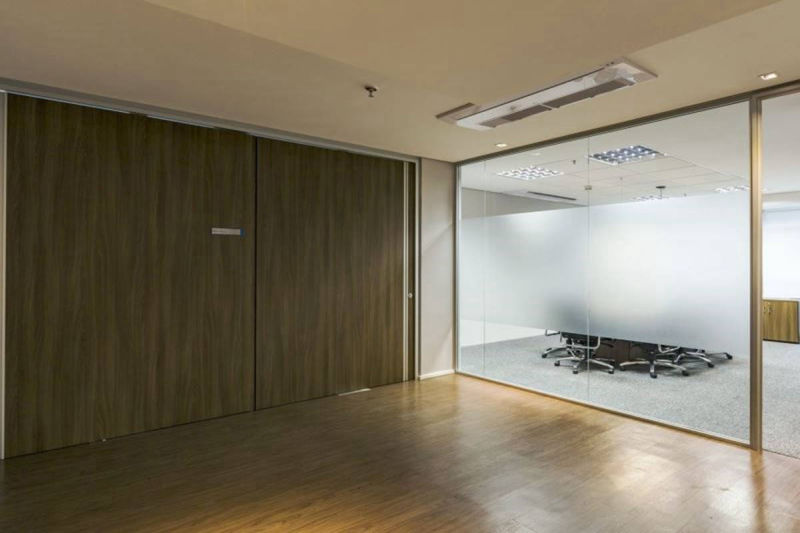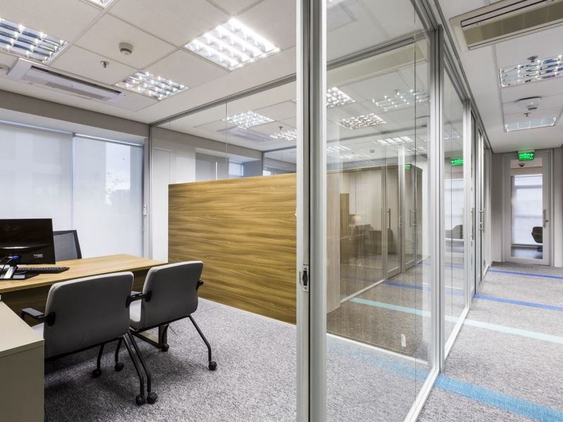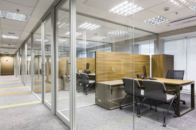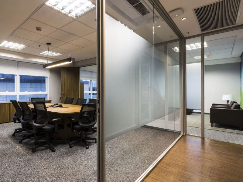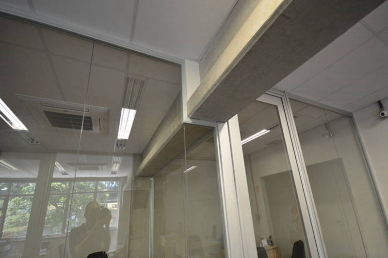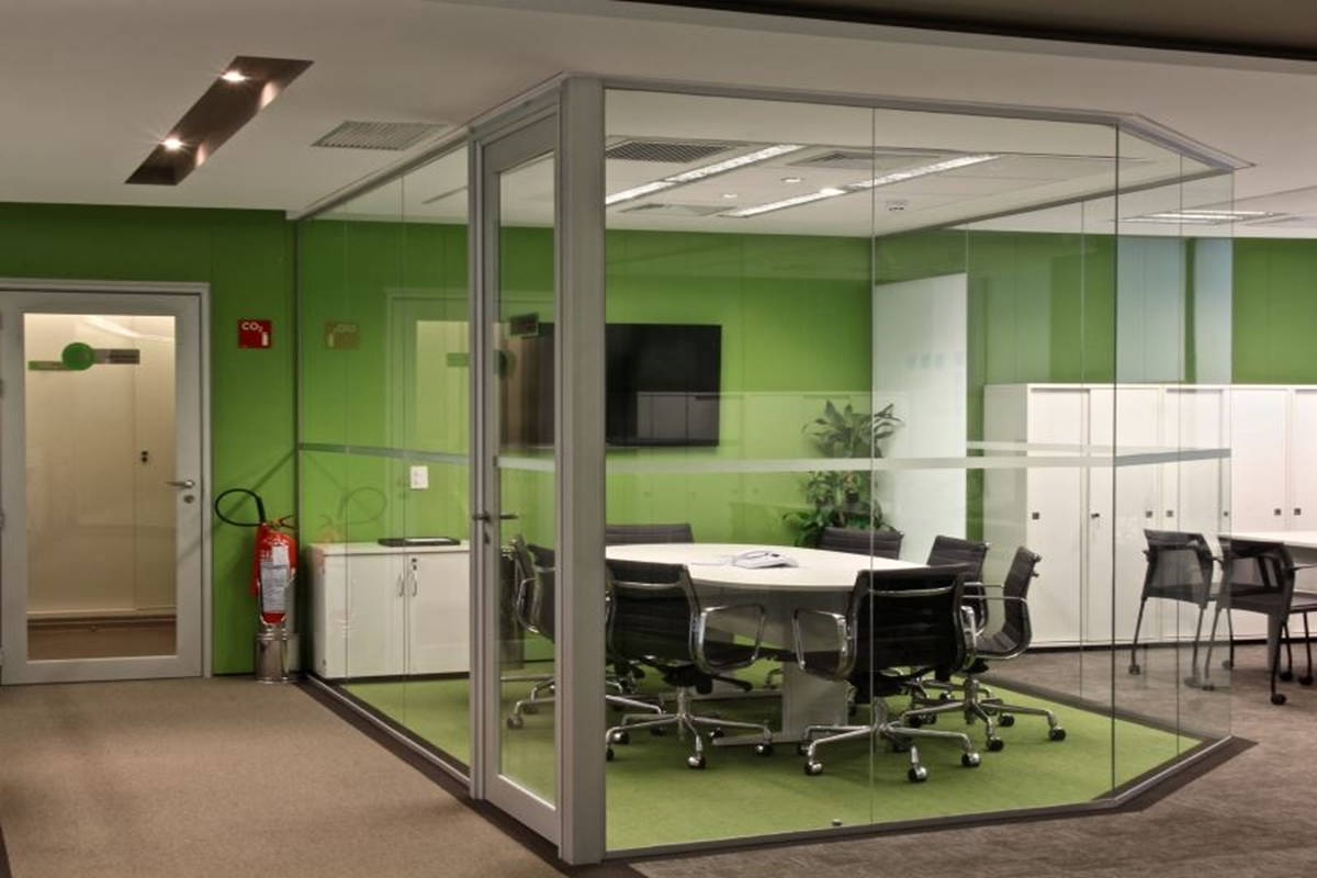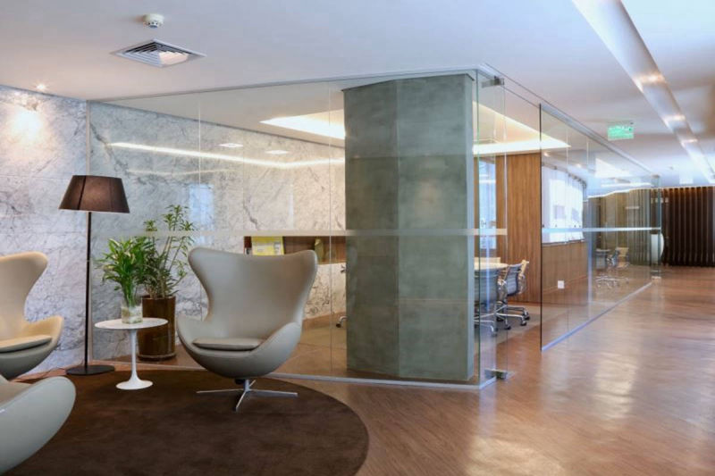 Paredes divisórias piso teto em grandes panos de vidro, modulares, removíveis e totalmente reutilizáveis, compõem-se num conjunto luminoso, harmonioso e funcional aos batentes e portas das mais diversas configurações.